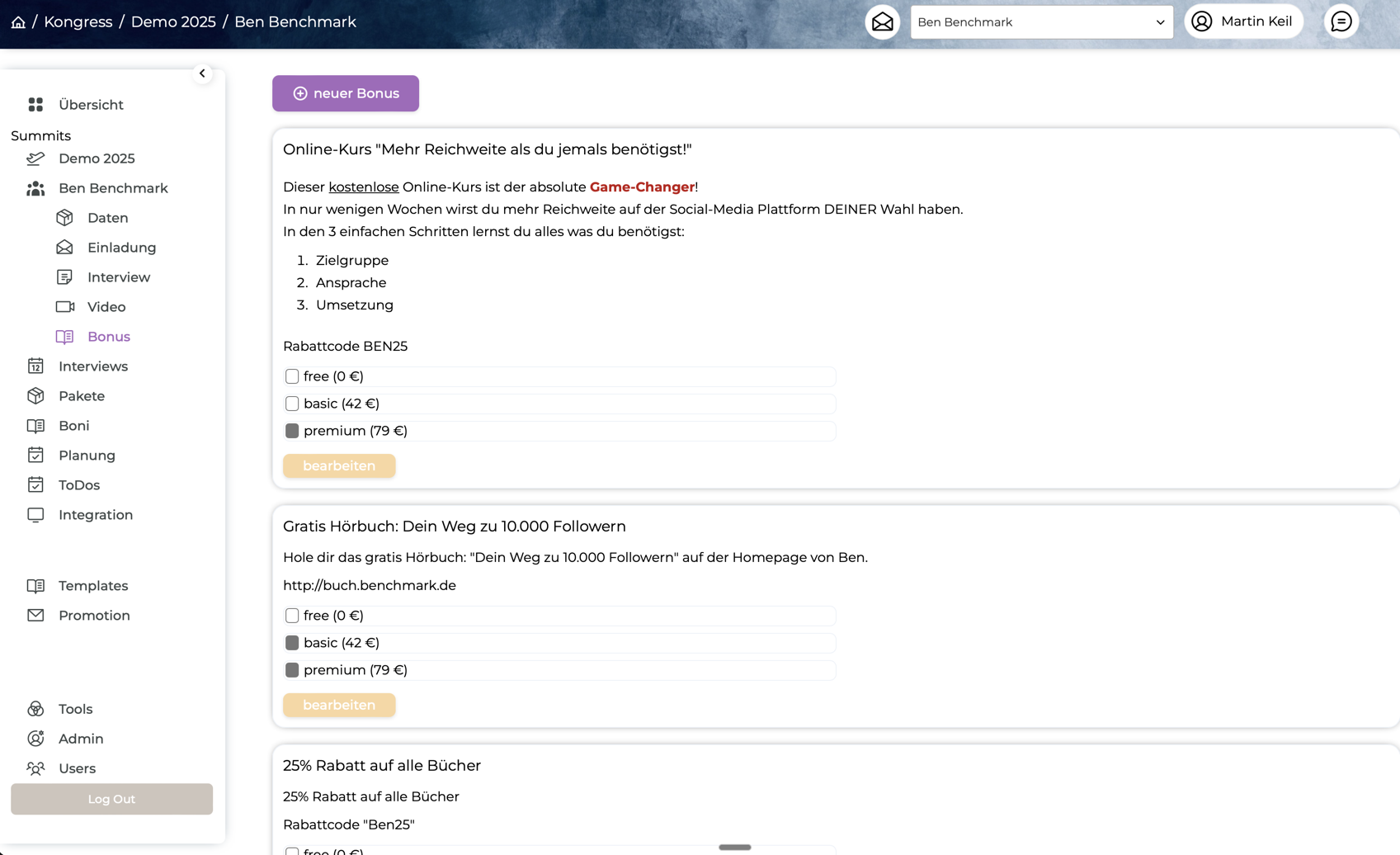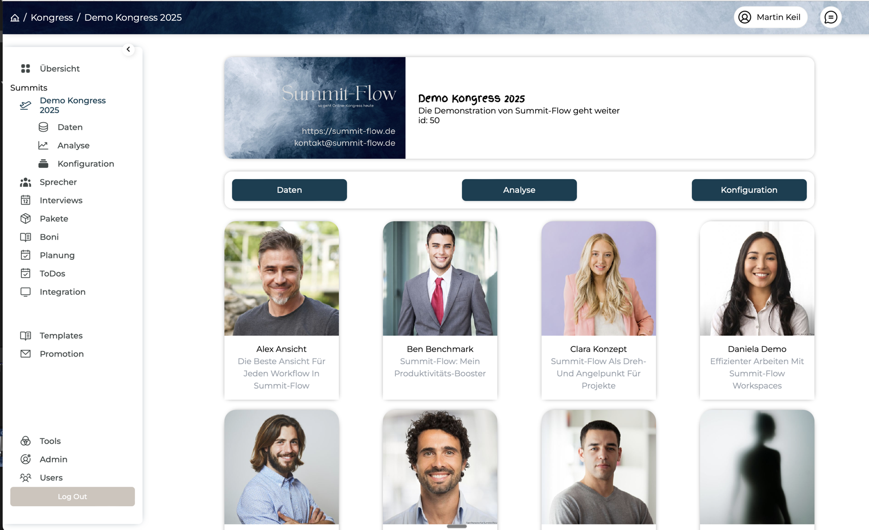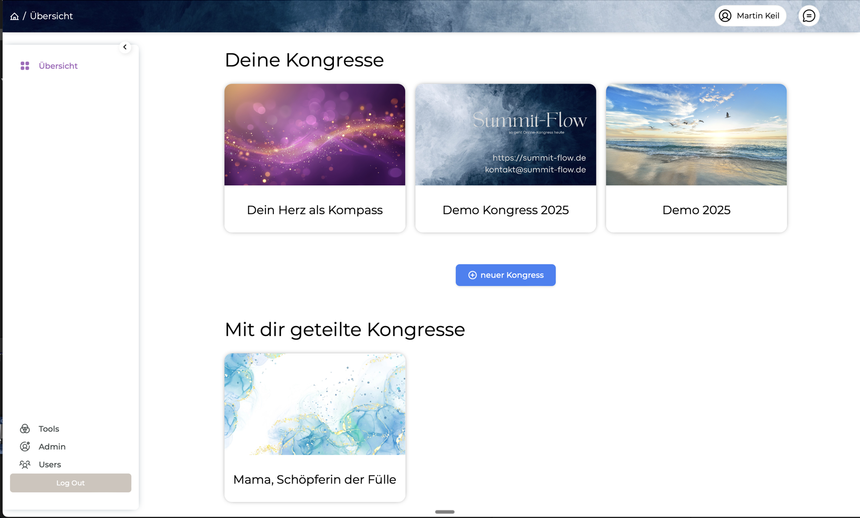 Summit-Flow ist Multi-Kongress fähig, das bedeutet du kannst gleichzeitig mehrere Kongresse planen oder auch durchführen.