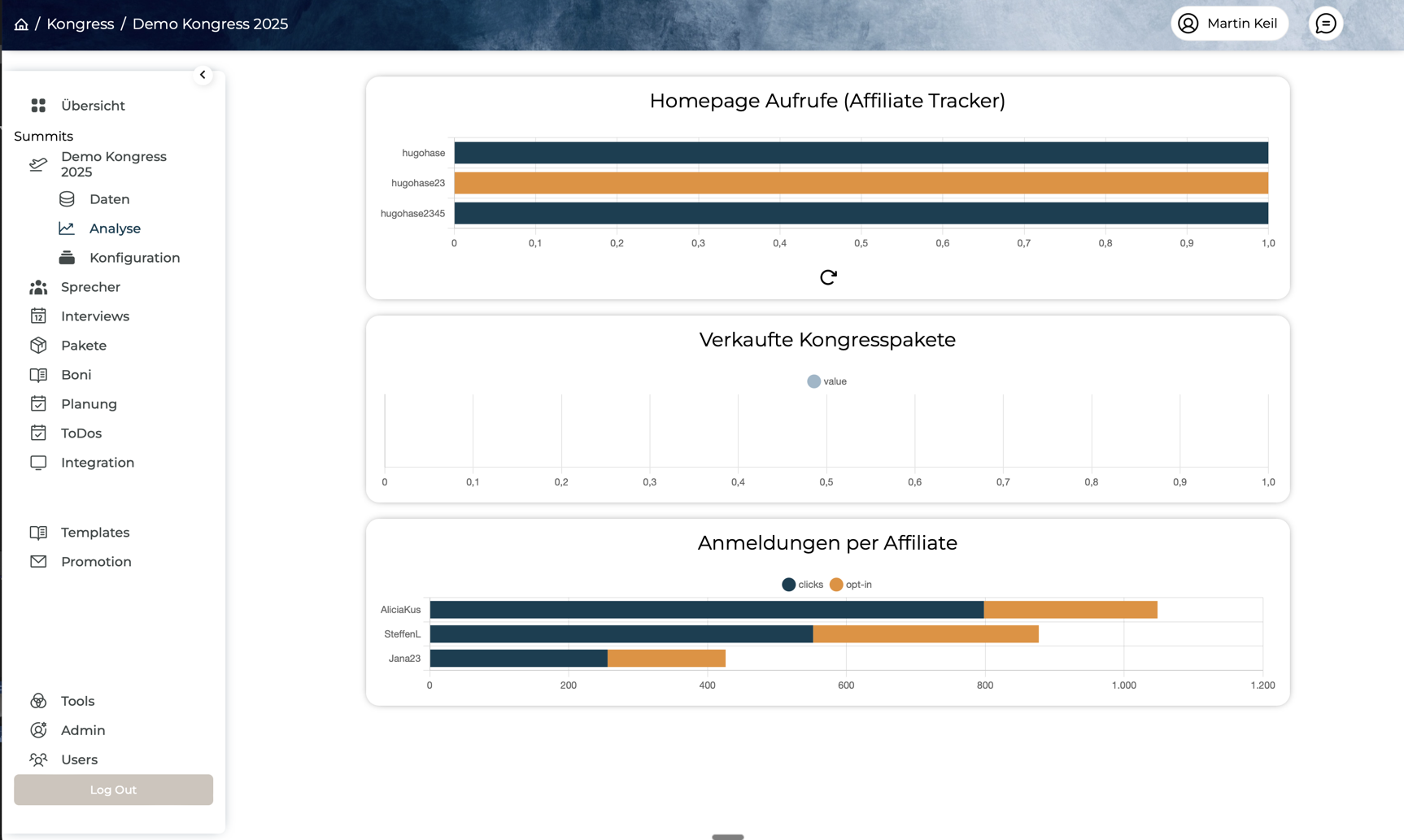 Neben der Anmeldung zum Kongress und dem erfolgreichen Opt-In auf deiner e-Mail Liste ist der Verkauf von Kongresspaketen selbstverständlich eine relevante Kennzahl, die Summit-Flow durch die Integration in Digistore24 (und in Zukunft weiterer Plattformen) einfach abbildet.