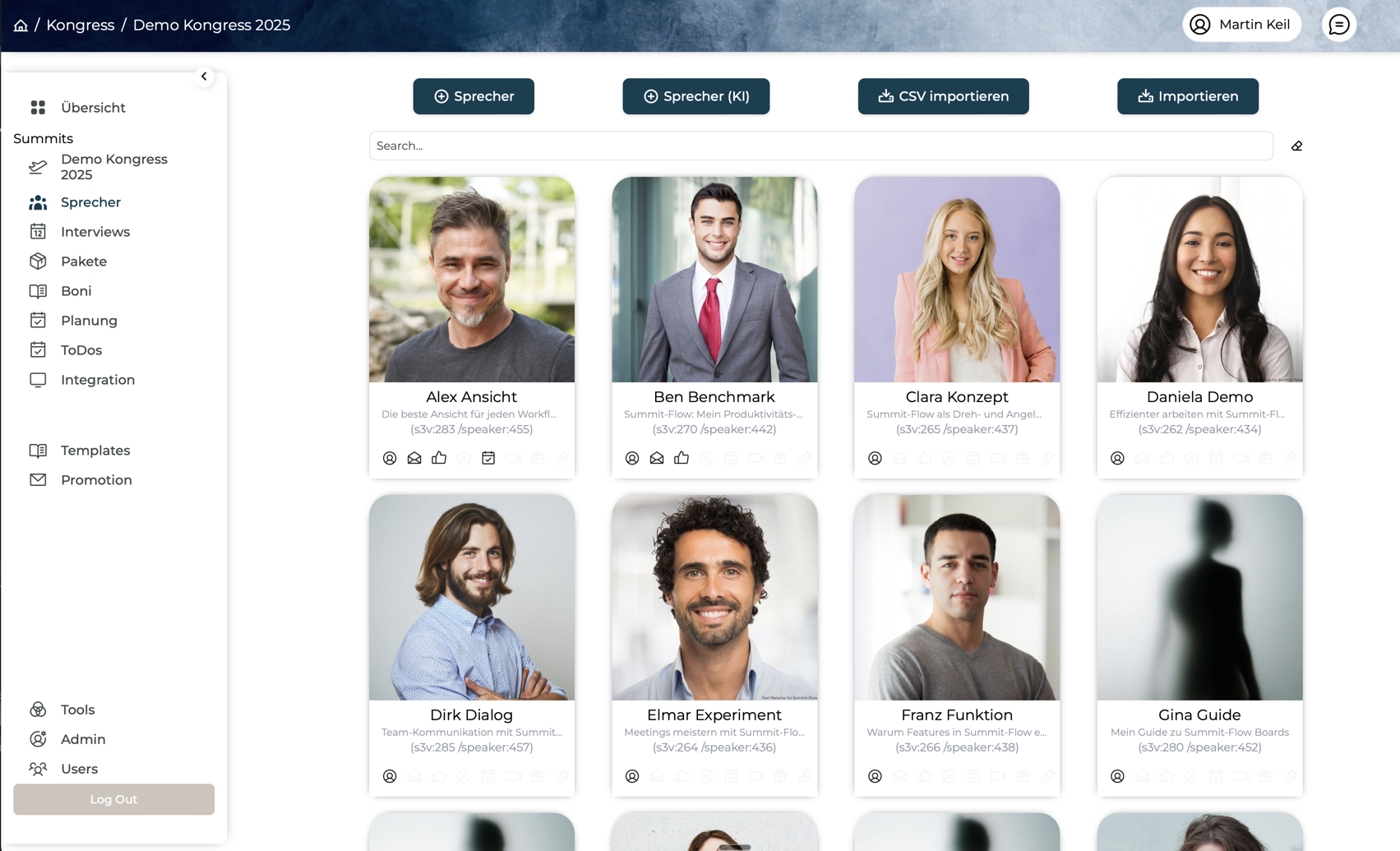 Alle dem Kongress zugeordneten Sprecher werden übersichtlich dargestellt. Bei Auswahl springst du direkt zum Sprecher und kannst diesen im Detail ansehen oder bearbeiten.