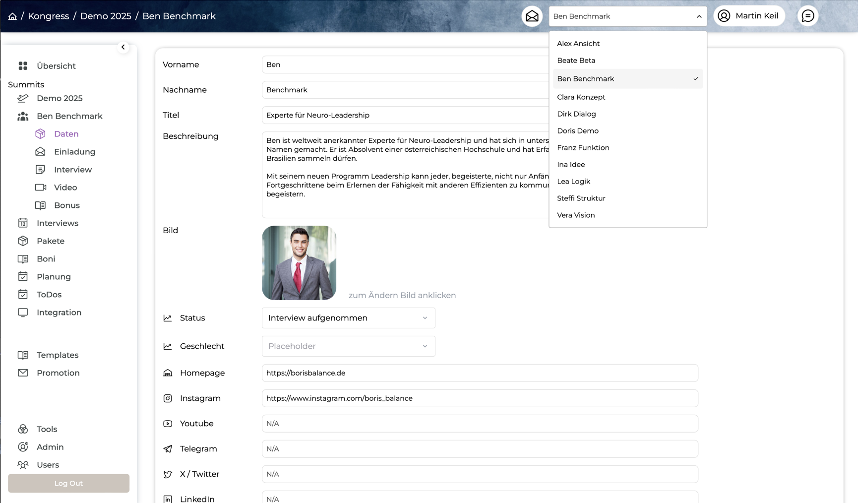 Sofern verfügbar kannst du auch Sprecher aus der öffentlichen Sprecher-Datenbank einfügen...einfacher geht es kaum. Selbstverständlich werden die Kongress-spezifischen Daten (wie z.B. Interview Name) immer noch von dir und nur für dich sichtbar gepflegt.