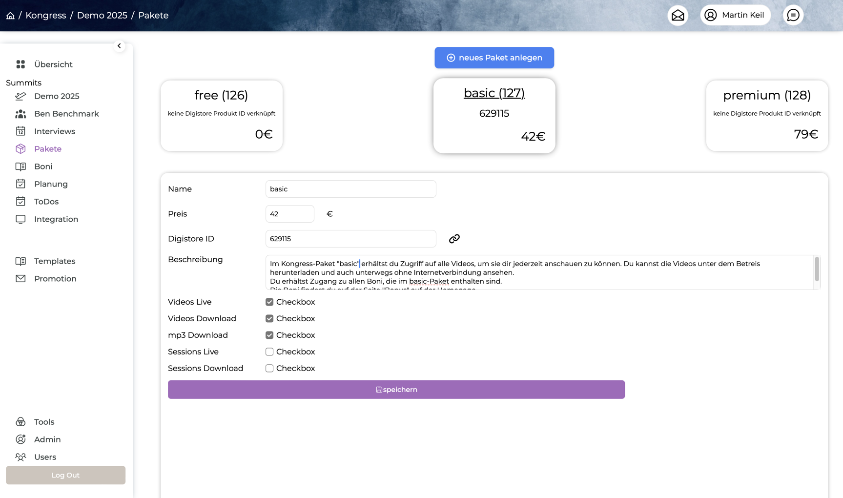 Nach dem Anlegen eines Kongresses kannst du einfach und übersichtlich die Basisdaten wie z.B. Titel, Headline, Start- & Enddatum, die Dauer der Videofreischaltung und ähnliches bearbeiten.