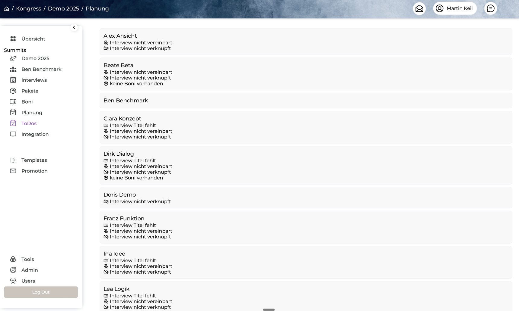 Um nichts zu vergessen erstellt Summit-Flow für dich automatisch ToDos, um dich an die wichtigsten Punkte zu erinnern...fehlt noch ein Foto eines Sprechers, ein Boni für ein Kongresspaket oder das hinterlegen eines Termins für dein Interview?