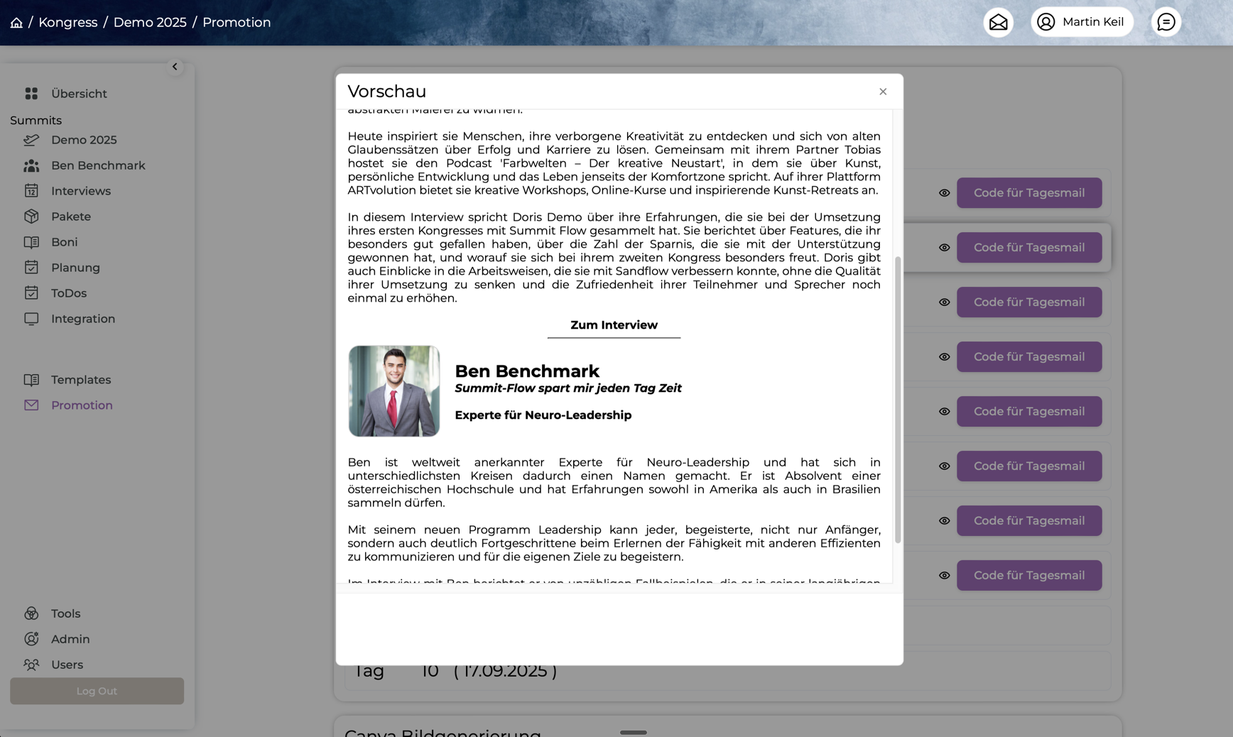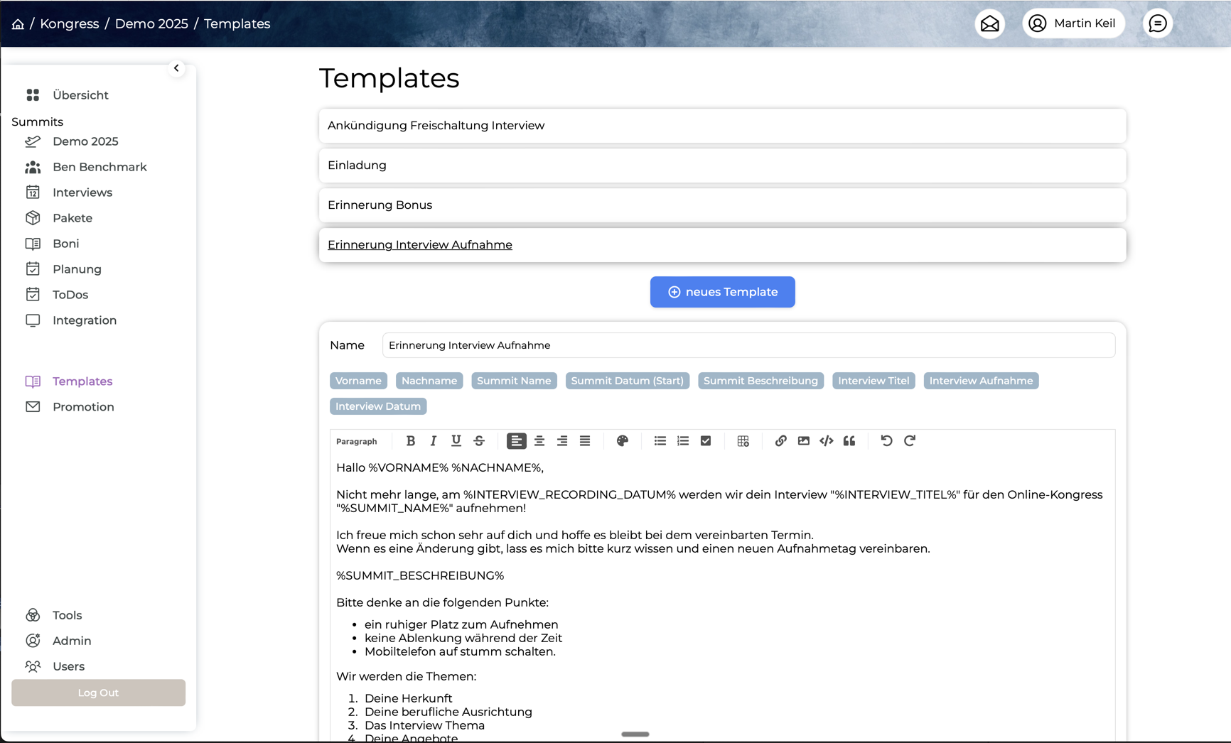 Über einen einfach zu bedienenden Editor können E-Mail Templates angelegt werden. Platzhalter wie Name, Interview- und Kongress Titel sowie andere kannst du spielend leicht hinzufügen und werden automatisch ersetzt.