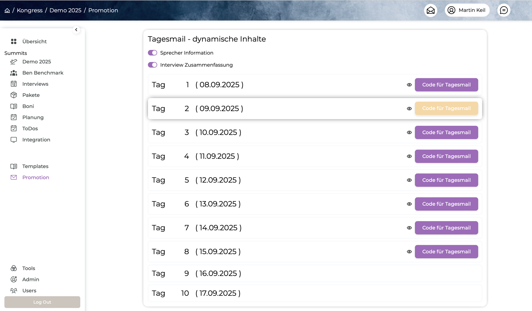 In einer übersichtlichen Darstellung ziehst du die Experten-Interviews per Drag & Drop an den richten Tag...das war's.
